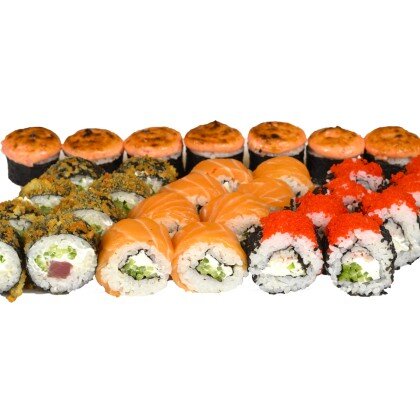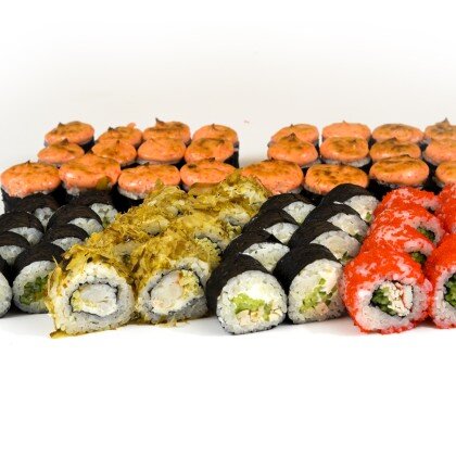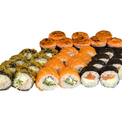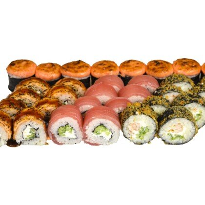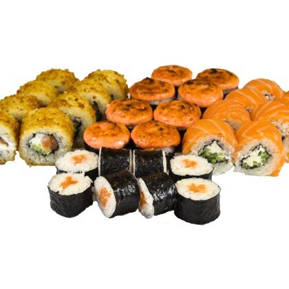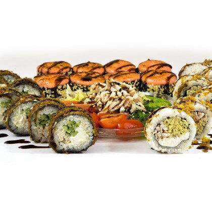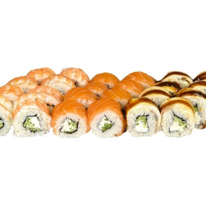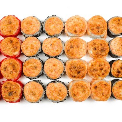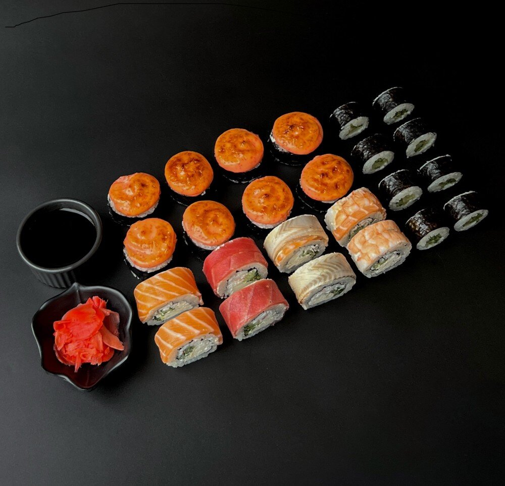 Запеченный ролл со снежным крабом, рыбный квартет, маки ролл с огурцом