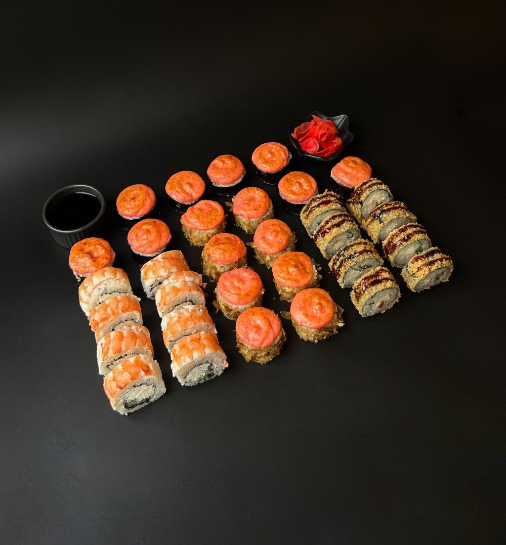 Филадельфия с креветкой, сырная креветка, запеченная креветка тамаго, темпура снежный краб