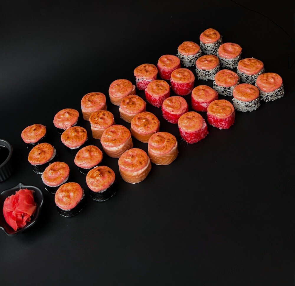 Запеченная калифорния, сырная креветка, запеченная филадельфия с лососем, острый запеченный тунец