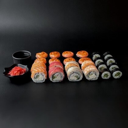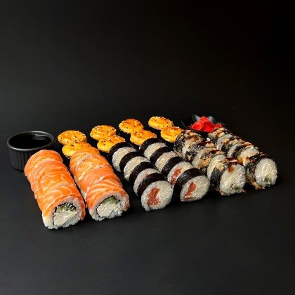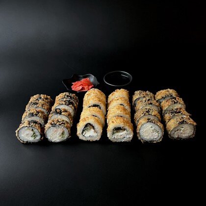 Запеченный ролл с креветкой, филадельфия с тунцом, темпура креветка, опаленная филадельфия