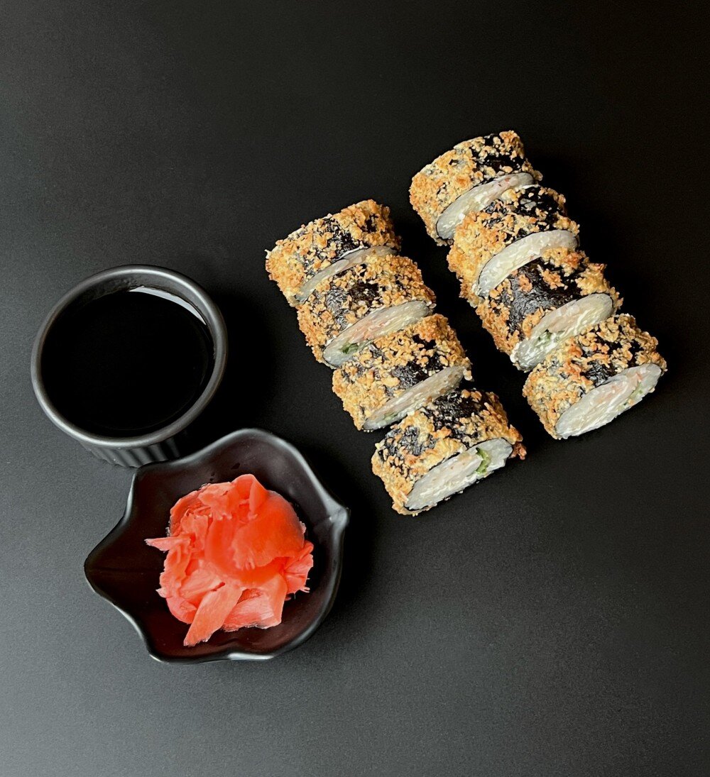 Рис, нори, креветка, огурец, сыр сливочный, унаги соус, темпура