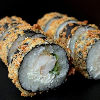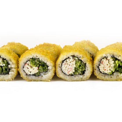 Рис, нори, тунец, огурец, сыр сливочный, унаги соус, темпура