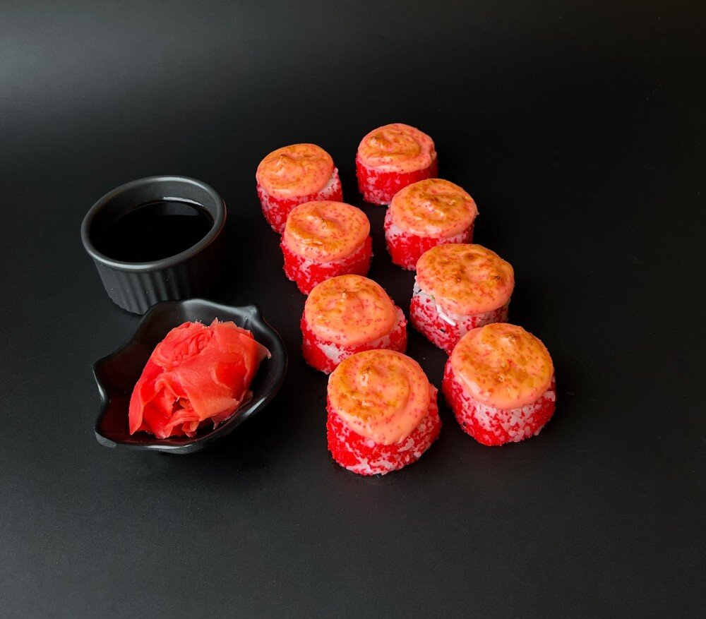 Рис, нори, сыр сливочный, огурец, икра масаго, снежный краб, спайси соус, унаги соус