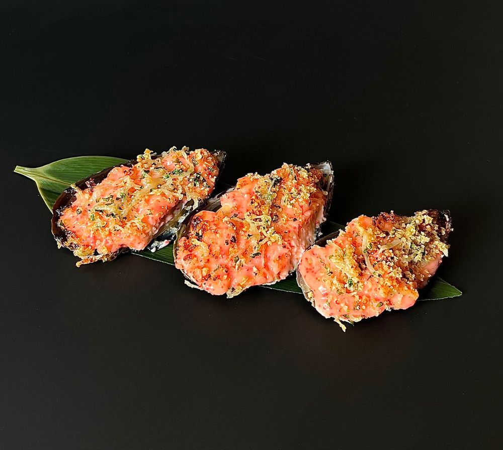 Запеченные голубые мидии под соусом спайси с посыпкой из пармезана и ароматных специй.