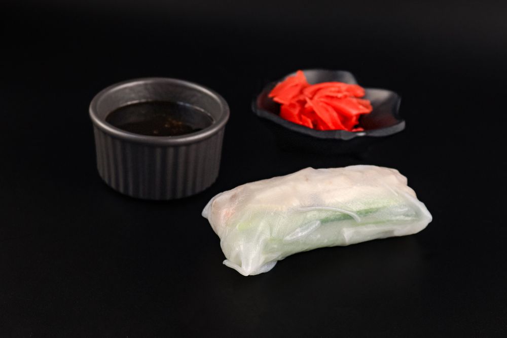 Цыпленок терияки, огурцы, айсберг, творожный сыр, спайси соус, рисовая бумага, соус унаги.